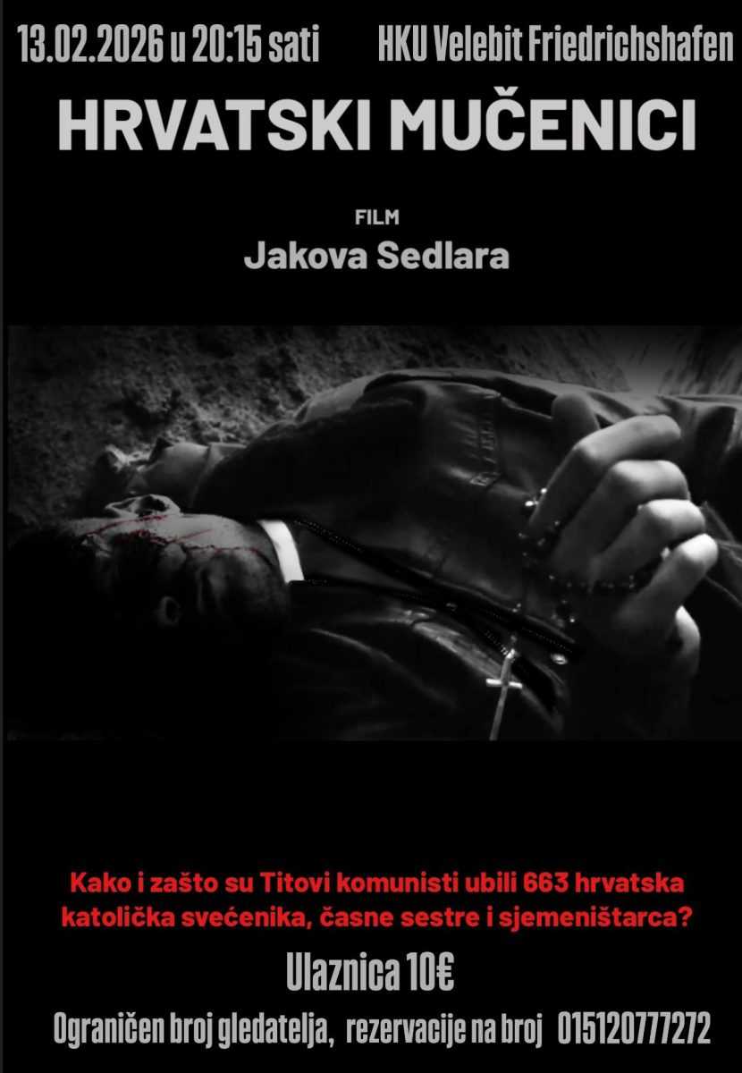 U prostorijama Hrvatske kulturne udruge (HKU) Velebit u Friedrichshafenu u petak je održana projekcija dokumentarnog filma „Hrvatski mučenici“ redatelja Jakova Sedlara, koja je okupila brojne gledatelje iz Friedrichshafena, Biberacha, Ehingena, Kemptena, Markdorfa, Ludwigshafena i Ravensburga.