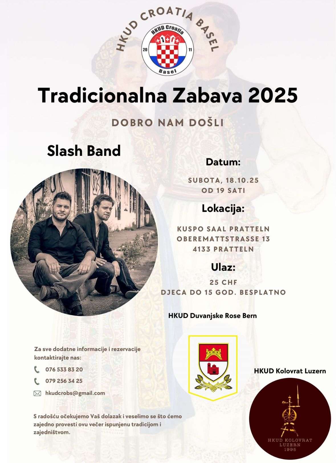 Ovaj događaj već godinama okuplja Hrvate iz cijele Švicarske, nudeći bogat program koji slavi narodnu baštinu kroz glazbu, ples i autentične nošnje. Za glazbeni dio večeri zadužen je popularni Slash Band, poznat po veseloj atmosferi i širokom repertoaru koji privlači sve generacije.