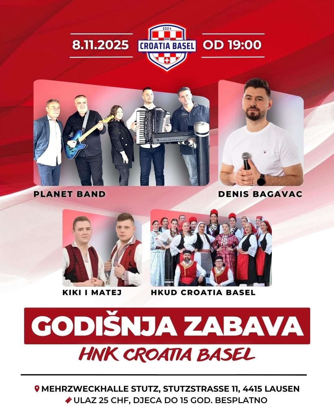 Tri tjedna kasnije, u subotu, 8. studenog 2025., hrvatska zajednica ponovno se okuplja, ovoga puta na Godišnjoj zabavi HNK Croatia Basel, koja će se održati u Mehrzweckhalle Stutz u Lausen (Stutzstrasse 11, 4415 Lausen), također s početkom u 19:00 sati.