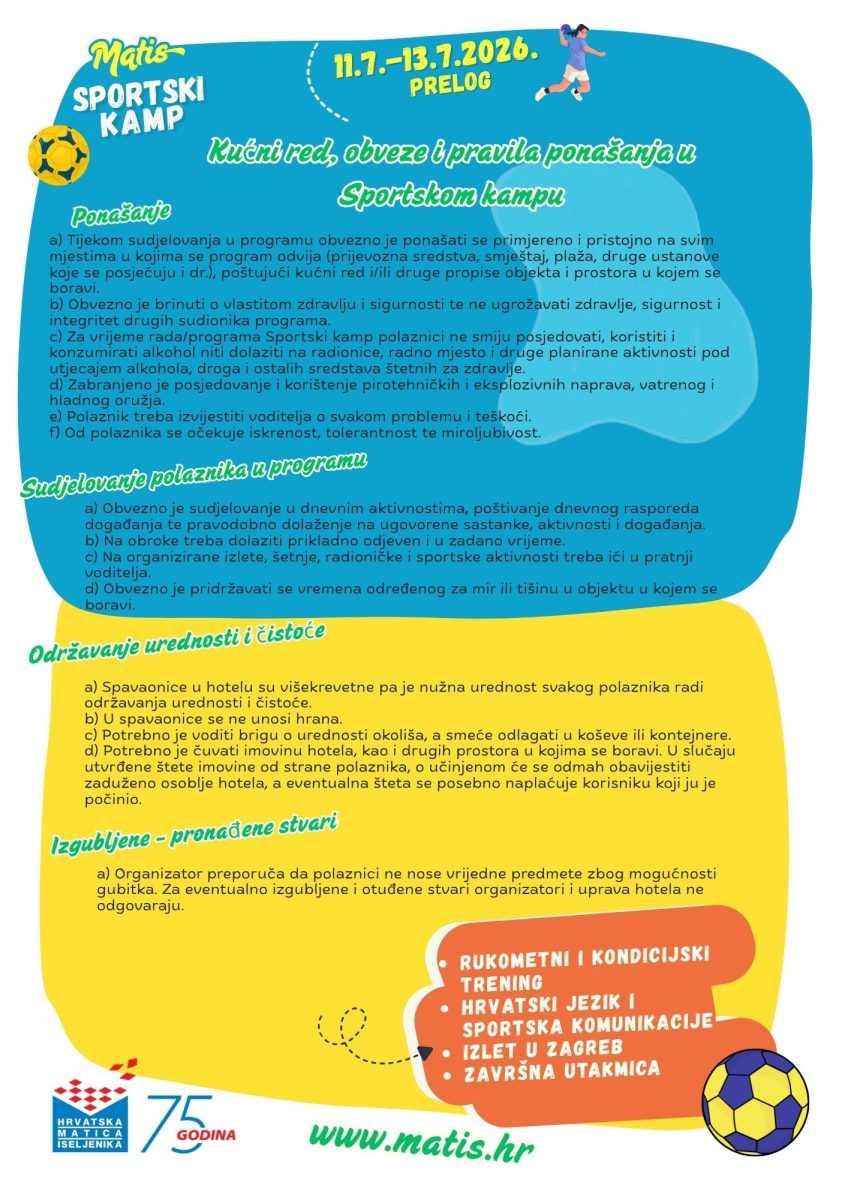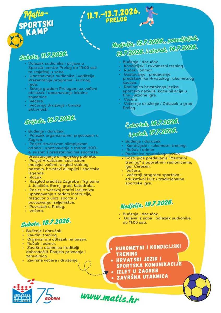 Hrvatska matica iseljenika pokreće novi program usmjeren na povezivanje mladih iz hrvatskog iseljeništva s domovinom. Sportski kamp održat će se od 11. do 19. srpnja 2026. u Prelogu. Riječ je o prvom izdanju programa koji kroz sport, edukaciju i zajedničko iskustvo boravka u Hrvatskoj potiče razvoj vještina, međusobno povezivanje i jačanje osjećaja pripadnosti hrvatskom identitetu.