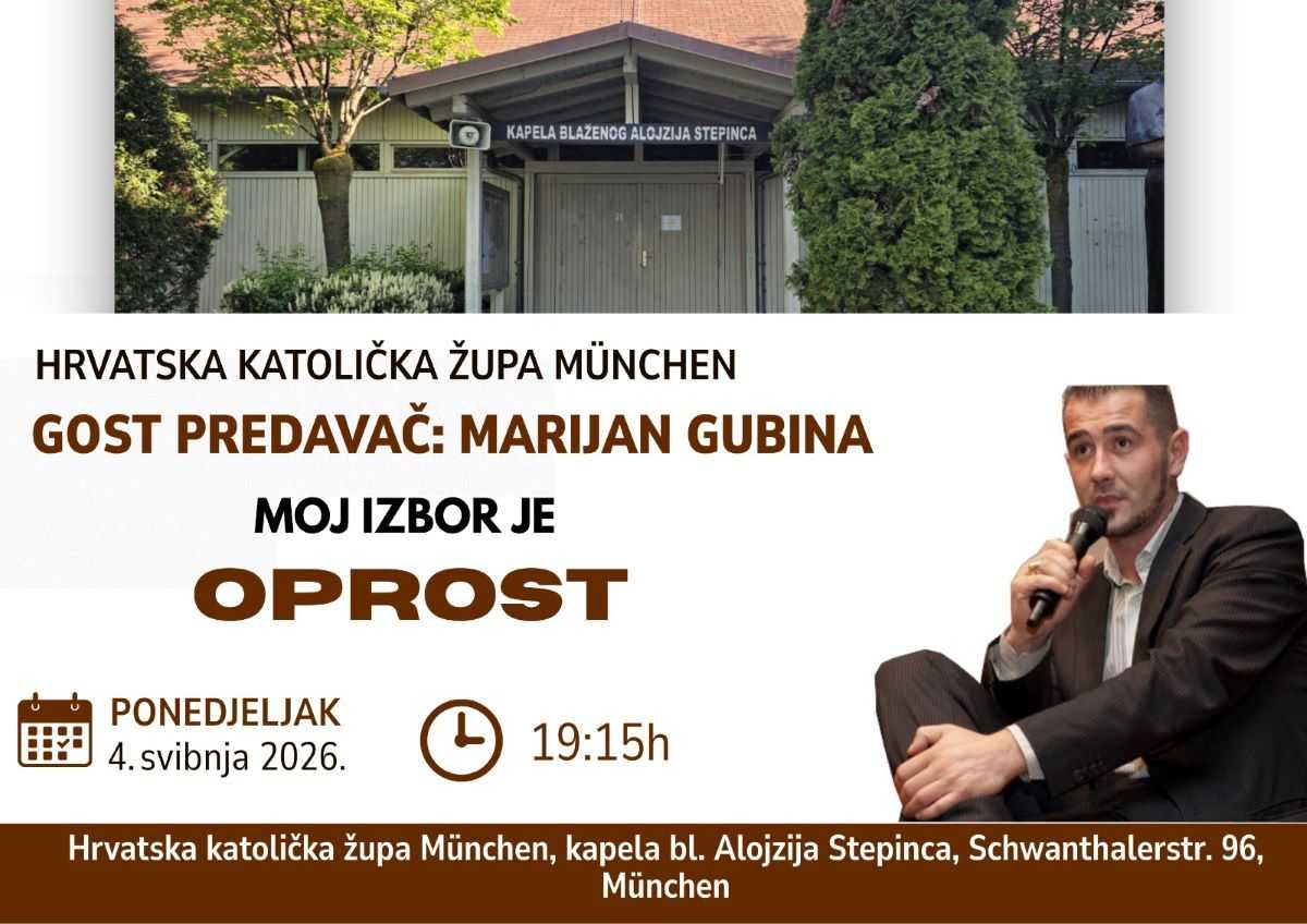Program gostovanja Marijana Gubine nastavlja se i u ponedjeljak, 4. svibnja, kada će u Hrvatskoj katoličkoj župi u Münchenu, nakon večernje svete mise, održati posebno predavanje na temu Snaga oprosta. Predavanje će započeti u 19:15 sati u kapelici sv. Alojzija Stepinca i donosi snažnu osobnu poruku čovjeka koji je preživio ratne strahote, a umjesto mržnje izabrao – oprost.