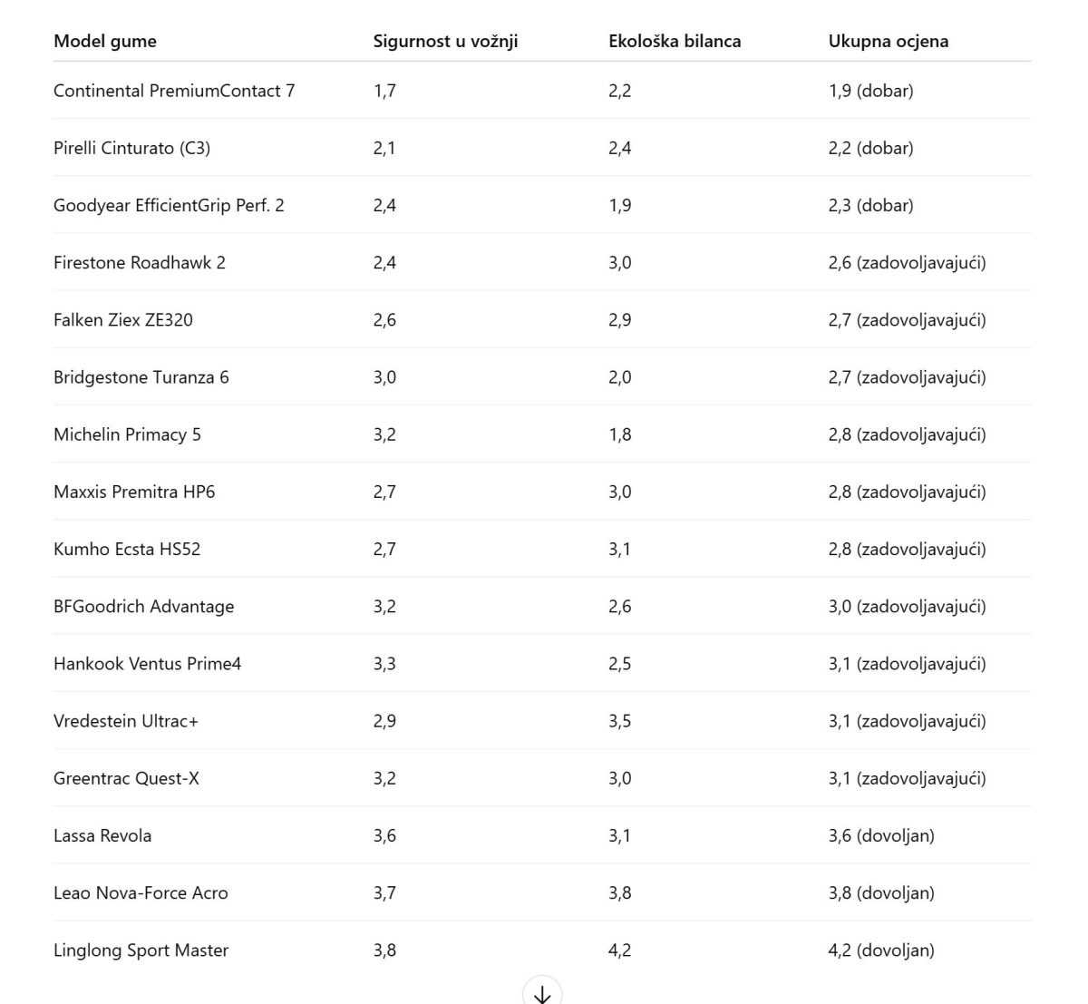 Najbolji ukupni rezultat ostvario je Continental PremiumContact 7 s ocjenom 1,9 („dobar“). Ovaj model pokazao je najvišu razinu sigurnosti u vožnji na suhom i mokrom kolniku.
