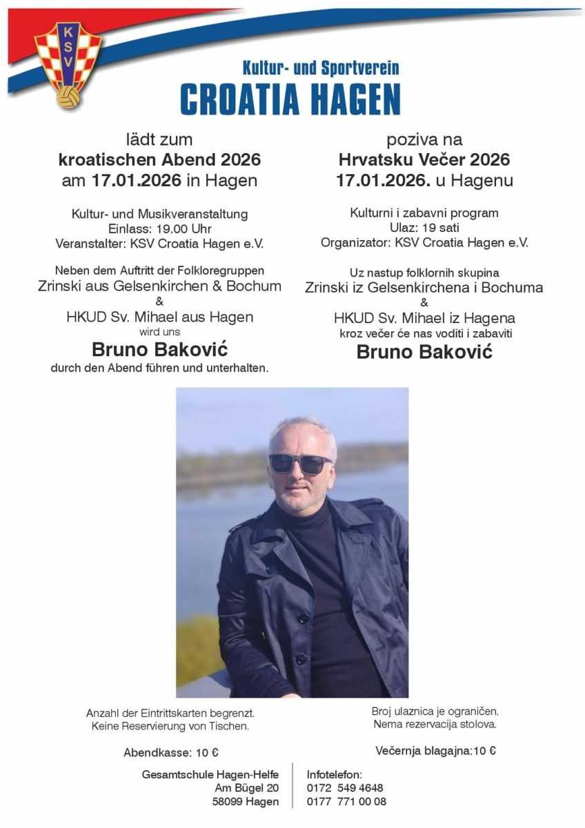 U subotu, 17. siječnja, u Hagenu (Sjeverna Rajna-Vestfalija) održat će se tradicionalna Hrvatska večer, koju organizira KSV Croatia Hagen e.V.
