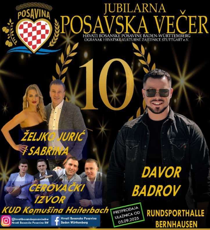 U organizaciji Hrvatske kulturne zajednice – Ogranak Hrvata Bosanske Posavine u Baden-Württembergu, u subotu, u Stuttgartu će se večeras, 11. listopada, održati jubilarno izdanje jednog od najvažnijih kulturnih događaja hrvatskog iseljeništva – Posavska večer 2025.